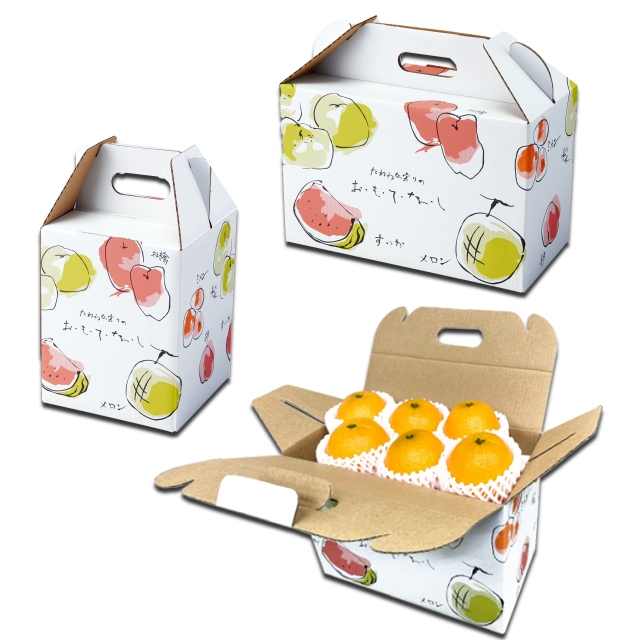 持ち手が付いていて、手さげとして持ち帰りやすい仕様。さらに、持ち手部分を折りたためば発送用の箱としても機能する2WAY構造で、見た目だけでなく機能性にも優れた設計となっております。メロン箱サイズではありますが、汎用性のあるデザインで、みかんをはじめ、様々な果実のギフトにご活用いただけます。