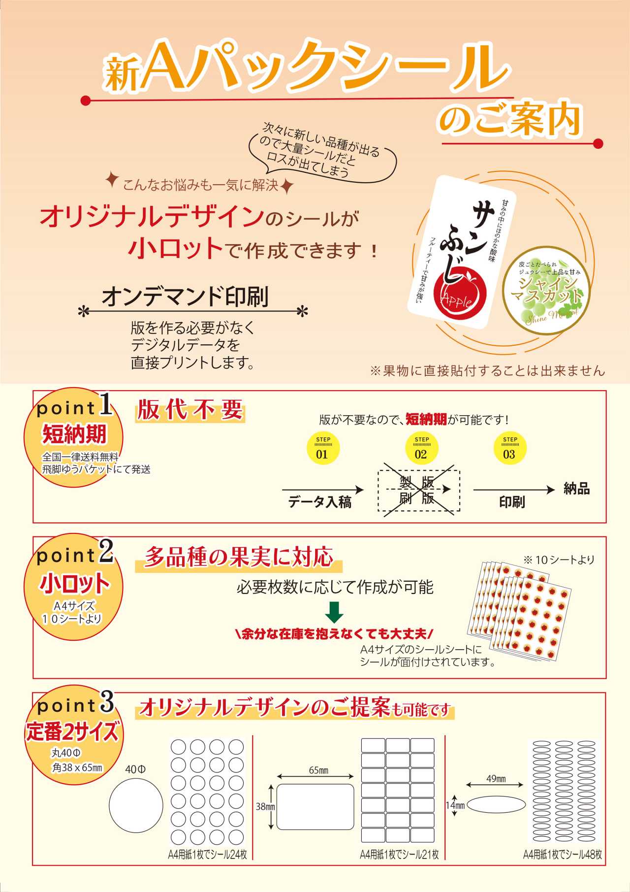・別注対応により、オリジナルデザインや、さまざまな品種の果物に対応します