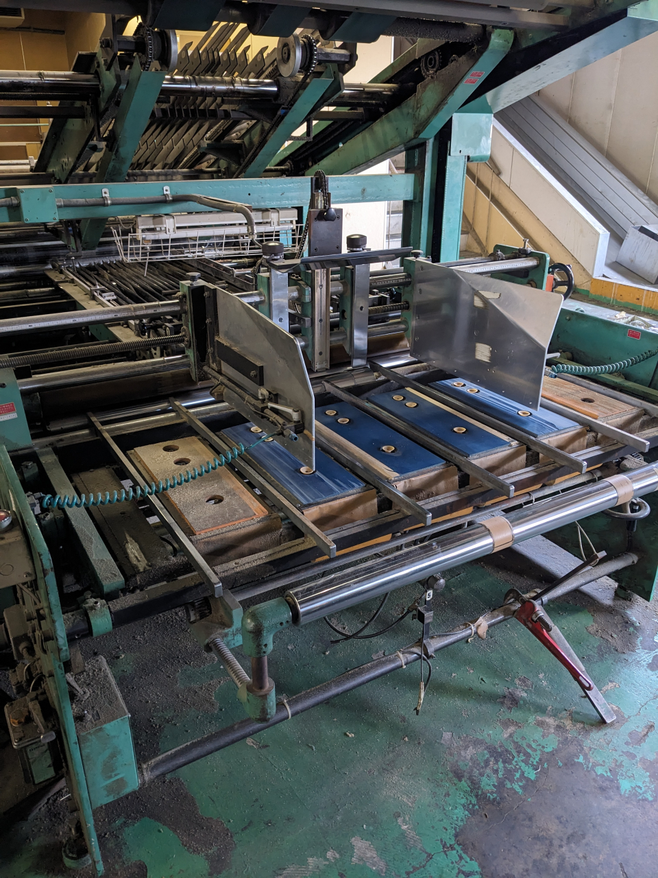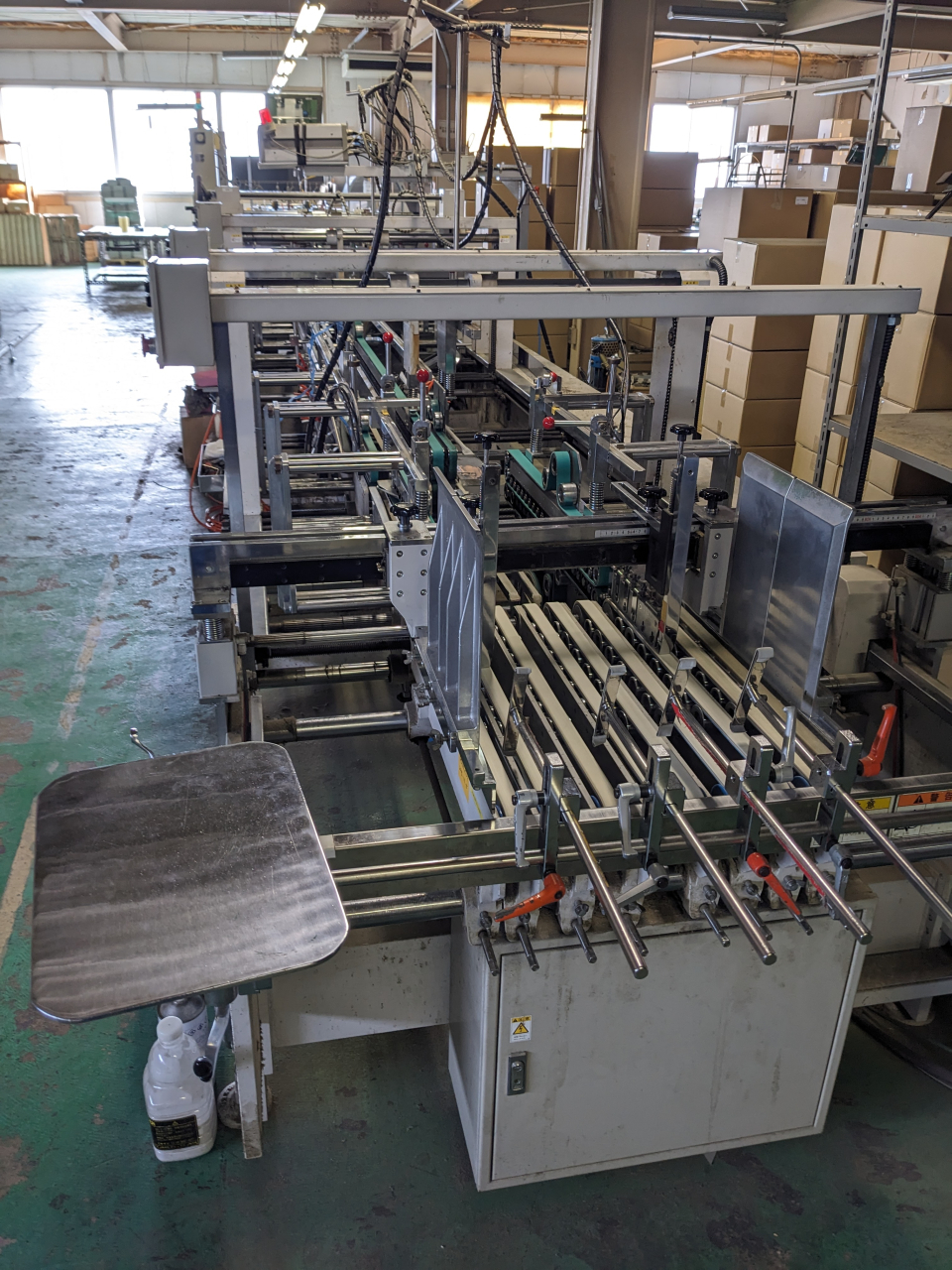 トムソン加工した材料に糊を吹き付け箱に仕上げ、梱包します。