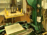 生地にニカワで糊付けした表紙を包み貼る機械です。最後の内側に折り込むところまで加工できます。見た目は大きい機械ですが女性でも簡単に扱えます。